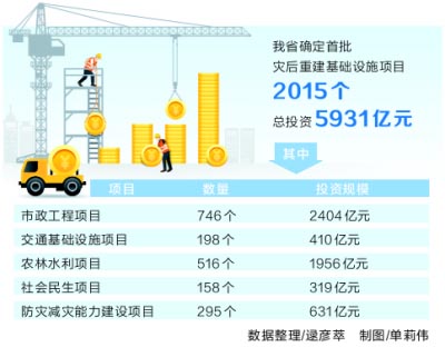 8月23日,記者從省發(fā)展改革委獲悉,我省確定首批災后重建基礎設施項目2015個,總投資5931億元,涉及市政工程項目、交通基礎設施項目、農林水利項目、社會民生項目、防災減災能力建設項目等多個領域。